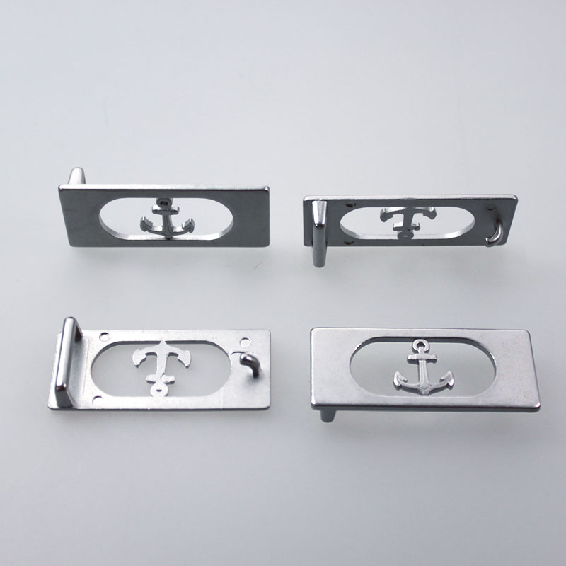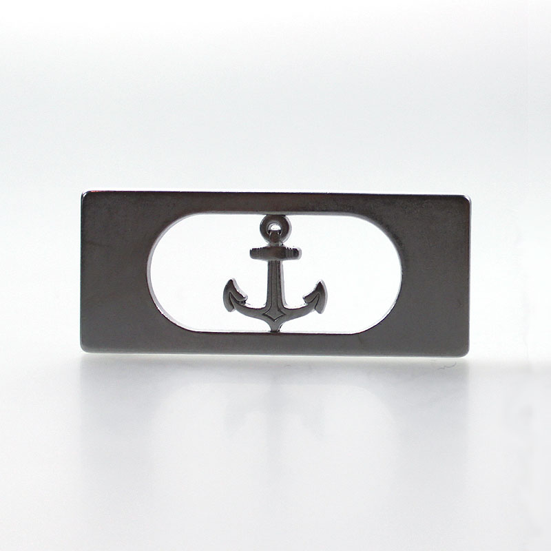 Gürtelschnalle mit rechteckiger Grundplatte. Der Anker sitzt in der Mitte einer ovalen Öffnung. Der Gürtel wird geschlossen, in dem man den Haken auf der Rückseite in einem Gürtelloch einhängst.