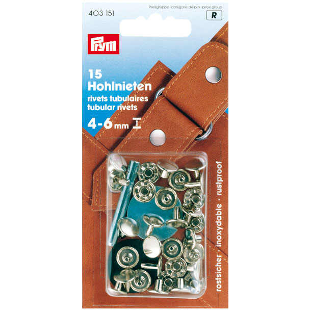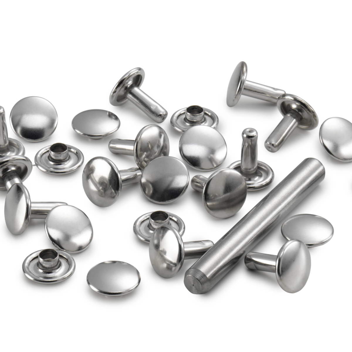 Silberfarbige Hohlnieten aus Messing. Ideal für Materialstärken von 4 - 6 mm. Das verwendete Material ist rostfrei. Der Kappendurchmesser liegt bei 9mm. Ober- und Unterteil sind geschlossen. Auch als Multipac mit 200 Stück lieferbar.