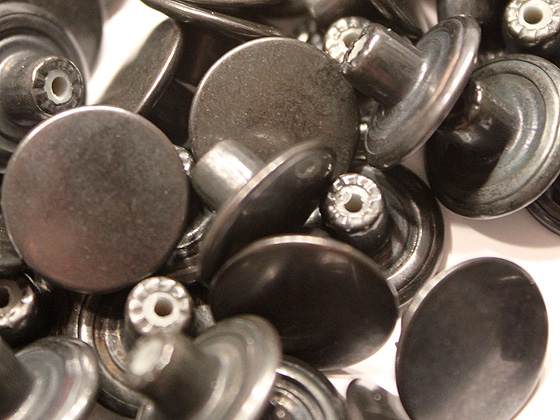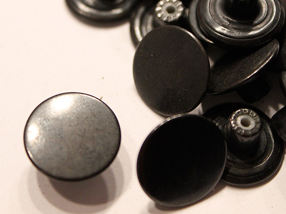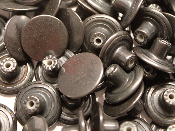 Schwarze Jeans-Knöpfe mit glatter Kappe. Aus rostfreiem Messing mit Kunststoffhals. Werden mit passendem Gegenstück geliefert. (Aluminium-Niet)