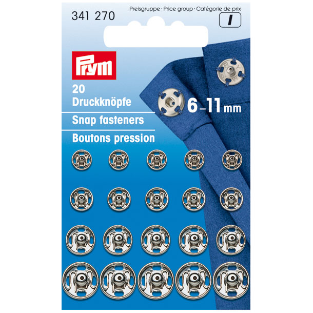 Jeweils 5 Annähdruckknöpfe in den Größen 6, 7, 9 und 11 mm.