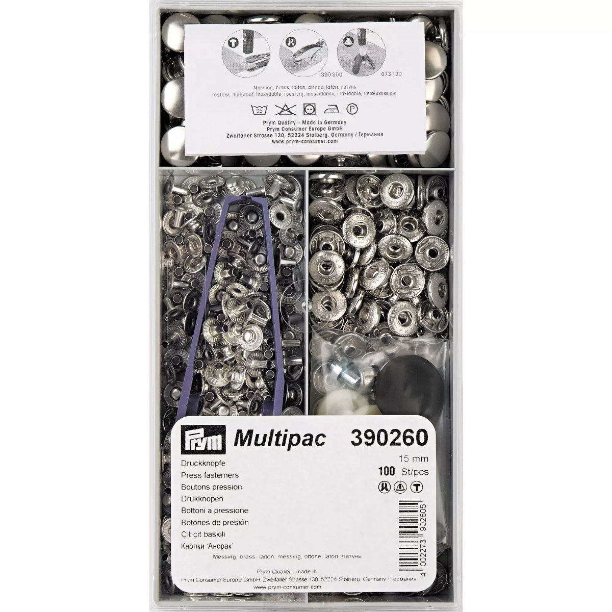 100 Stück - Druckknöpfe Modell "Anorak" incl. passenden Werkzeugen. Die Knöpfe bestehen aus den 4 Einzelteilen Kappe, Federteil, Kugelteil und Niet