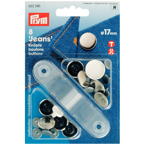 Nähfrei-Jeans-Knöpfe aus Messing in silberfarbig glatt. Können mit dem beiliegenden Werkzeug oder Vario-Zange verarbeitet werden.