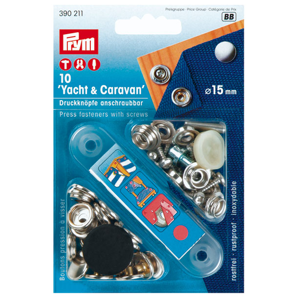 Karte mit Druckknöpfen, Schrauben, Werkzeug und Anleitung. Dieser Artikel kann mit den Sport&Camping-Druckknöpfen kombiniert werden.