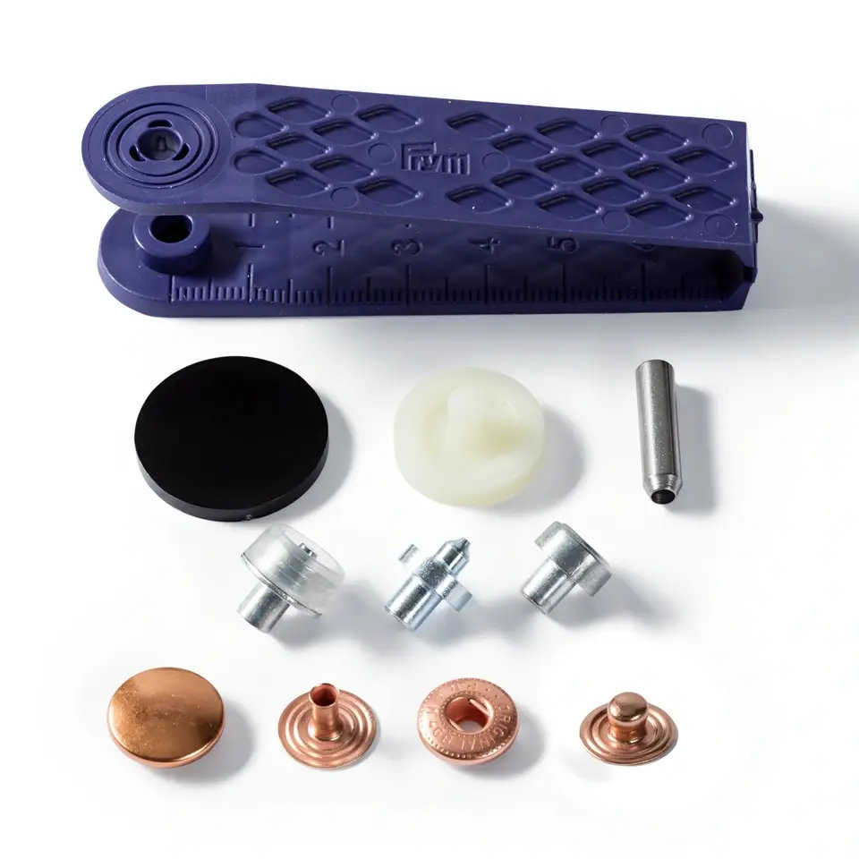 Die Packung enthält neben den Knöpfen auch eine Anleitung und Werkzeuge. Wir empfehlen den Einsatz der Vario-Zange.