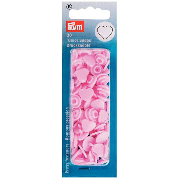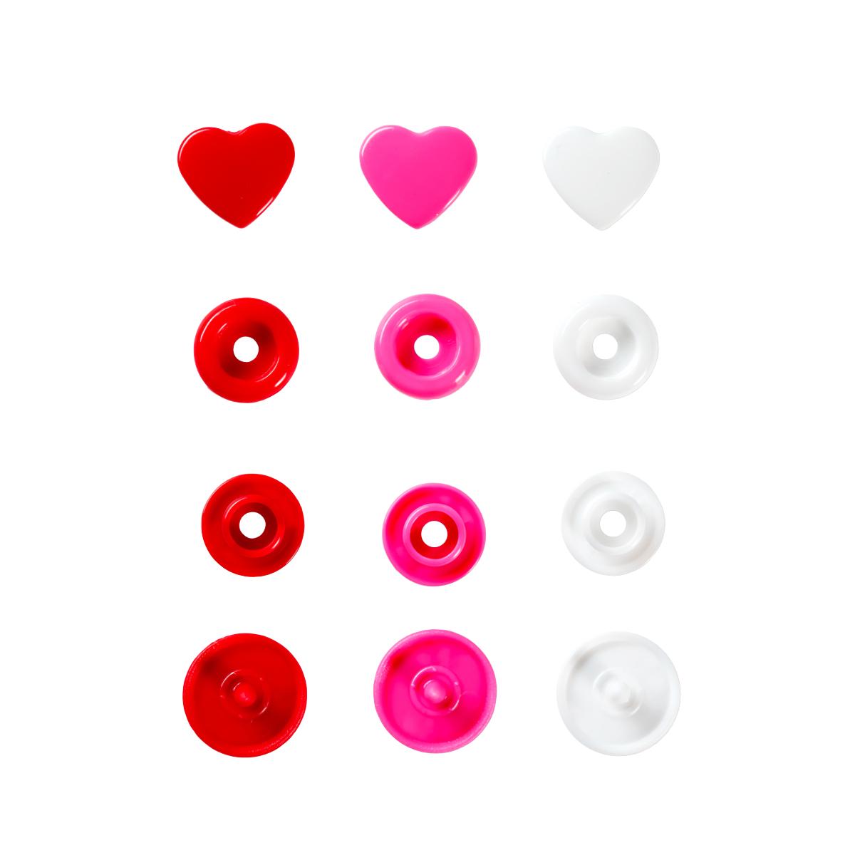 Farbenfrohe Kunststoff-Druckknöpfe in Form eines Herz. Lassen sich ohne Probleme mit der Vario-Zange verarbeiten.