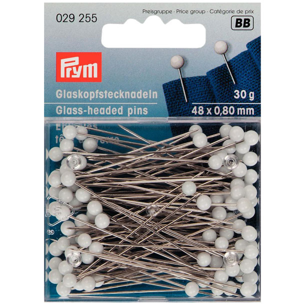 Glaskopfnadeln mit rostgeschütztem, gehärteten Stahlschaft in den Maßen 0,80 x 48 mm.