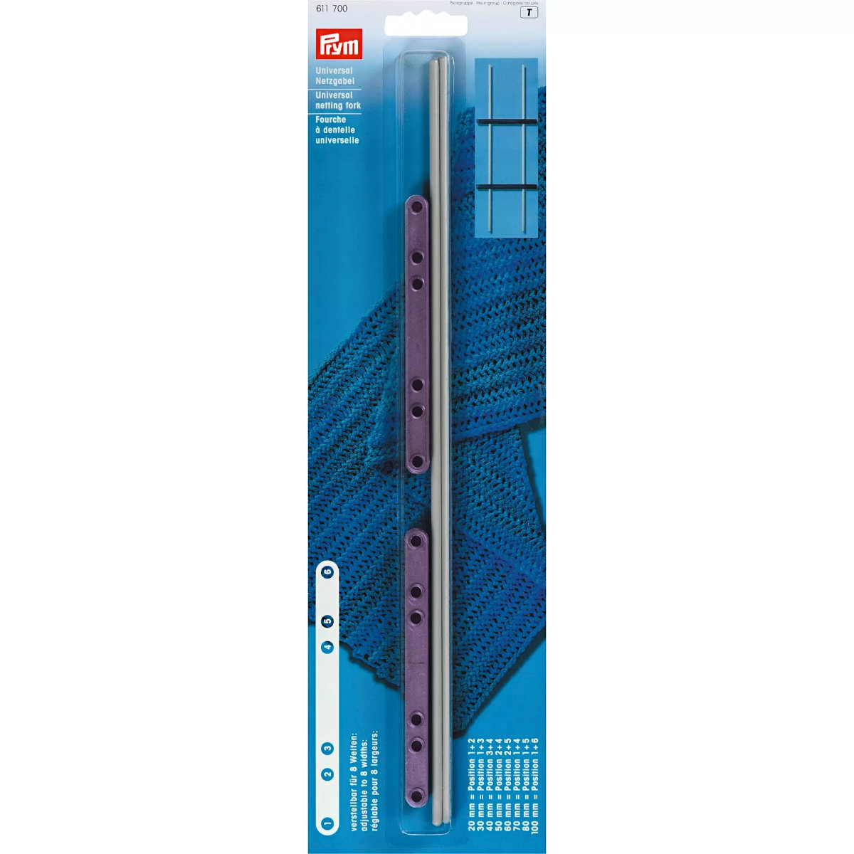 Die Netzgabel von Prym ist ein verstellbarer Rahmen zum Gabelhäkeln netzartiger Wollstreifen, die je nach Projekt hinterher zusammengehäkelt werden.