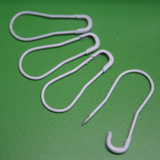 Weisse Sicherheitsnadeln in der beliebten Birnenform. Packung mit 1.000 Stück.