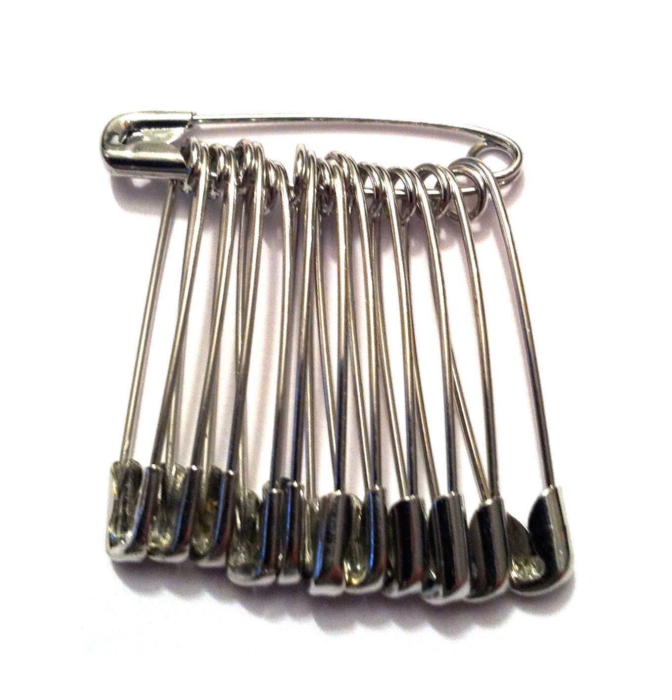 Karton mit 100 Bündeln mit 12 Sicherheitsnadeln in der Größe 28mm.Insgesamt also 1.200 silberfarbige Sicherheitsnadeln.