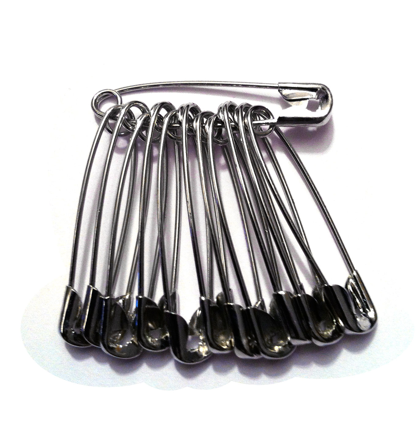 Karton mit 100 Bündeln mit 12 Sicherheitsnadeln in der Größe 38 mm.Insgesamt also 1.200 silberfarbige Sicherheitsnadeln.