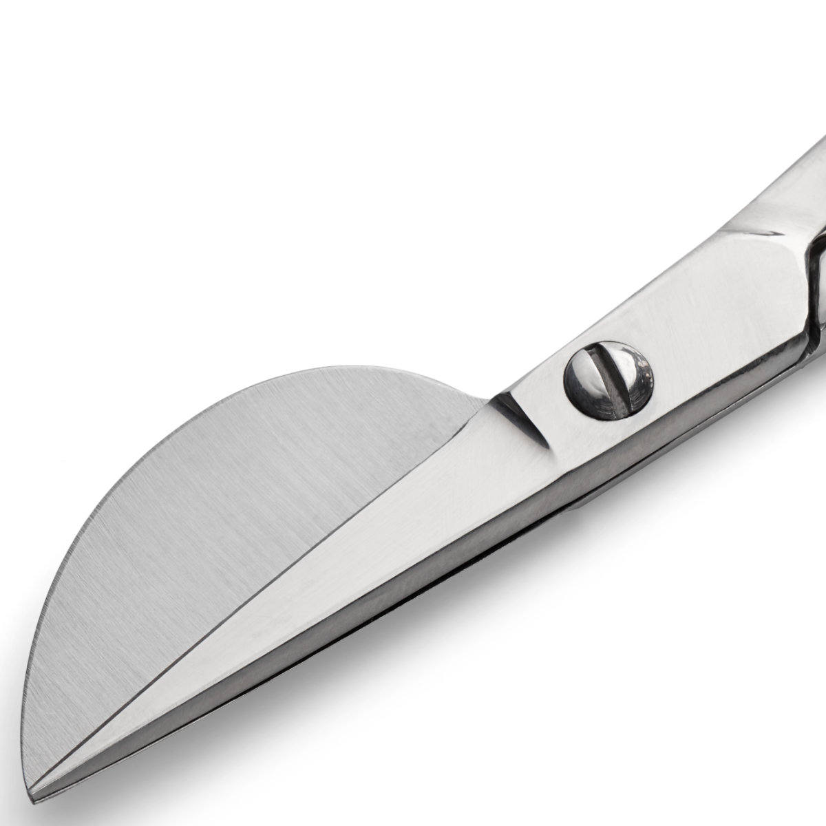 Applikationsscheren können dank des unteren Bogens an der Schneidklinge ganz flach auf den Stoff aufgelegt werden – so lässt sich überflüssiges Material bei der Applikation leicht abschneiden. Auch der Winkel im Scherengriff sorgt dafür, dass sich die Schneidklinge besonders nah an den Stoff bringen lässt.