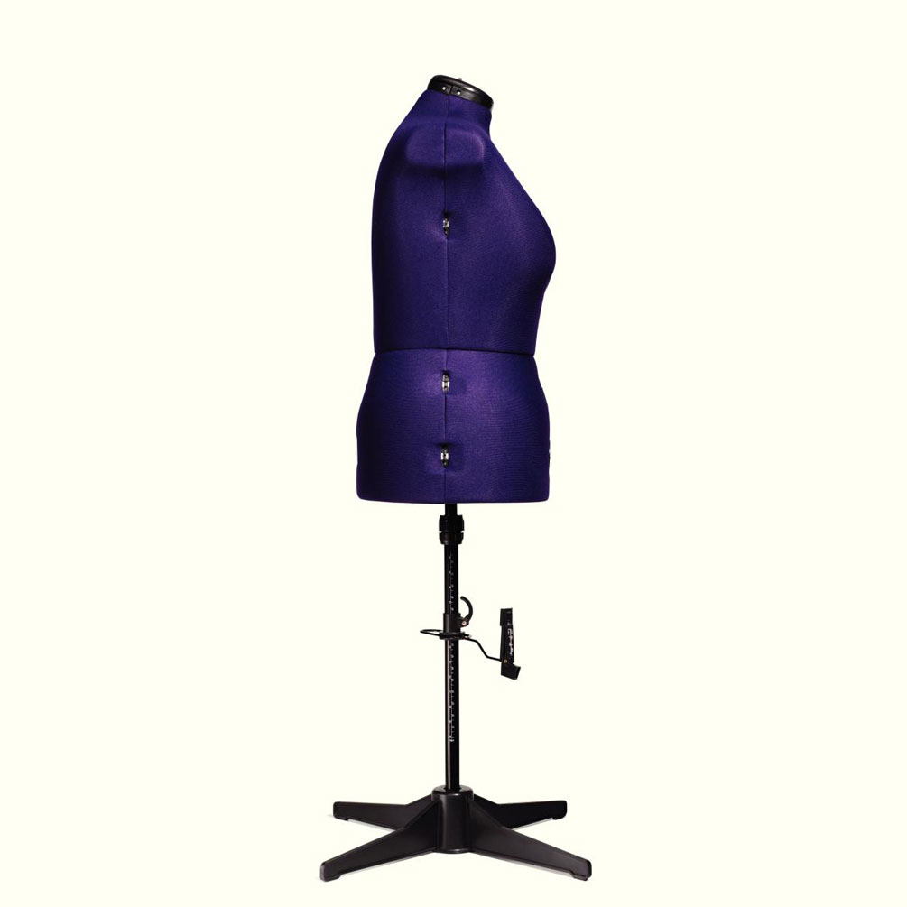 Drehbare 8-teilige Schneiderbüste mit integriertem Nadelkissen am Halsbereich, stabilem Kunststoff-Standfuß und Rockabrunder mit Stecknadelfixierung;